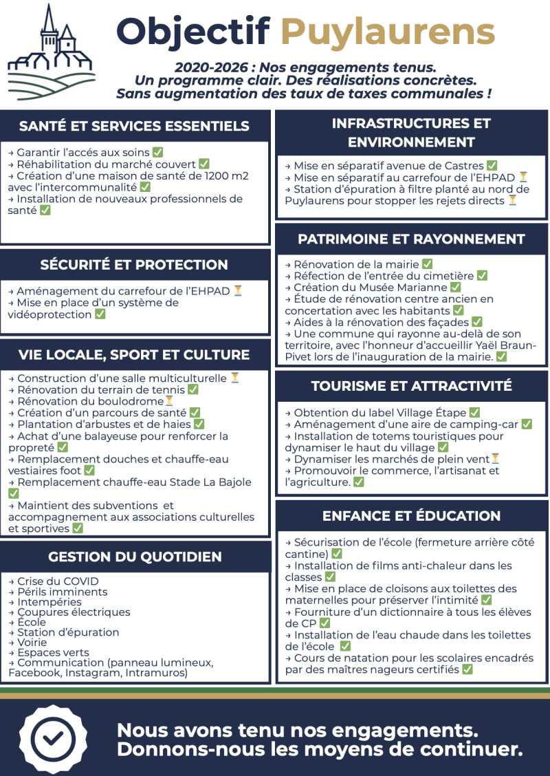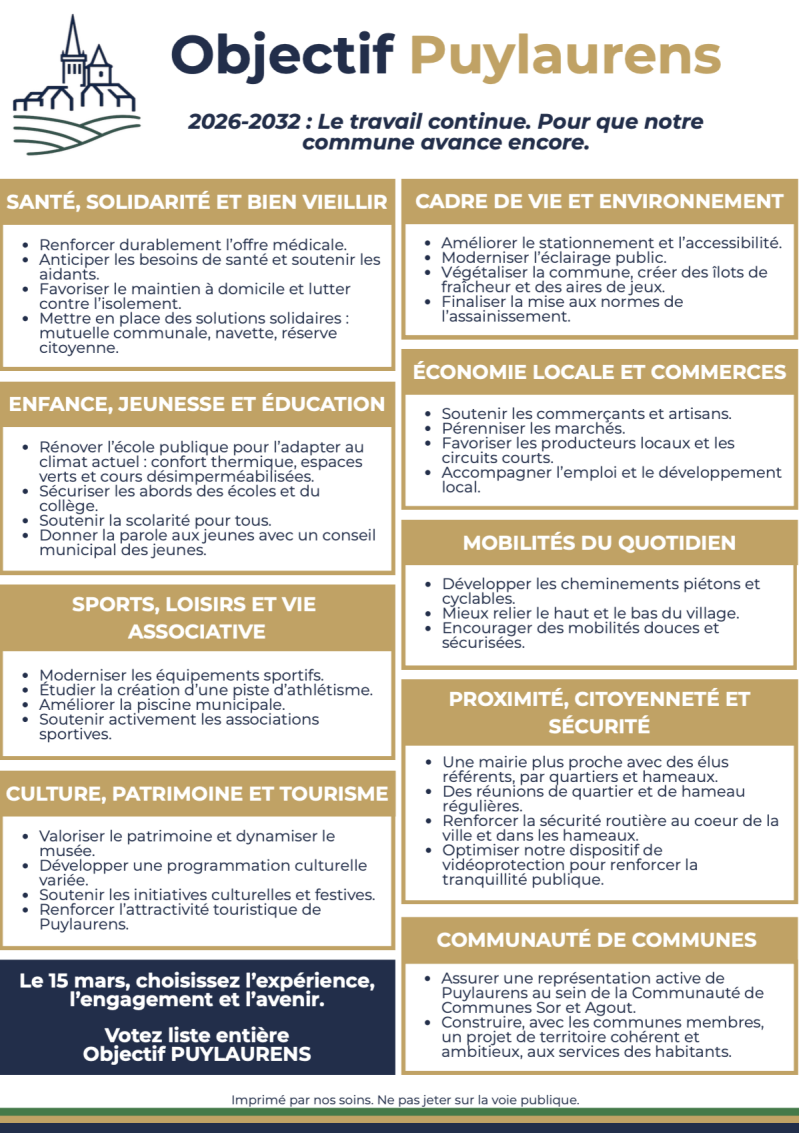 Le programme de la liste Objectif Puylaurens est assuré par une équipe compétente (11 élus actuels) accompagnée par des femmes et des hommes animés de la volonté de réussir ce projet municipal avec la maîtrise des finances publiques!